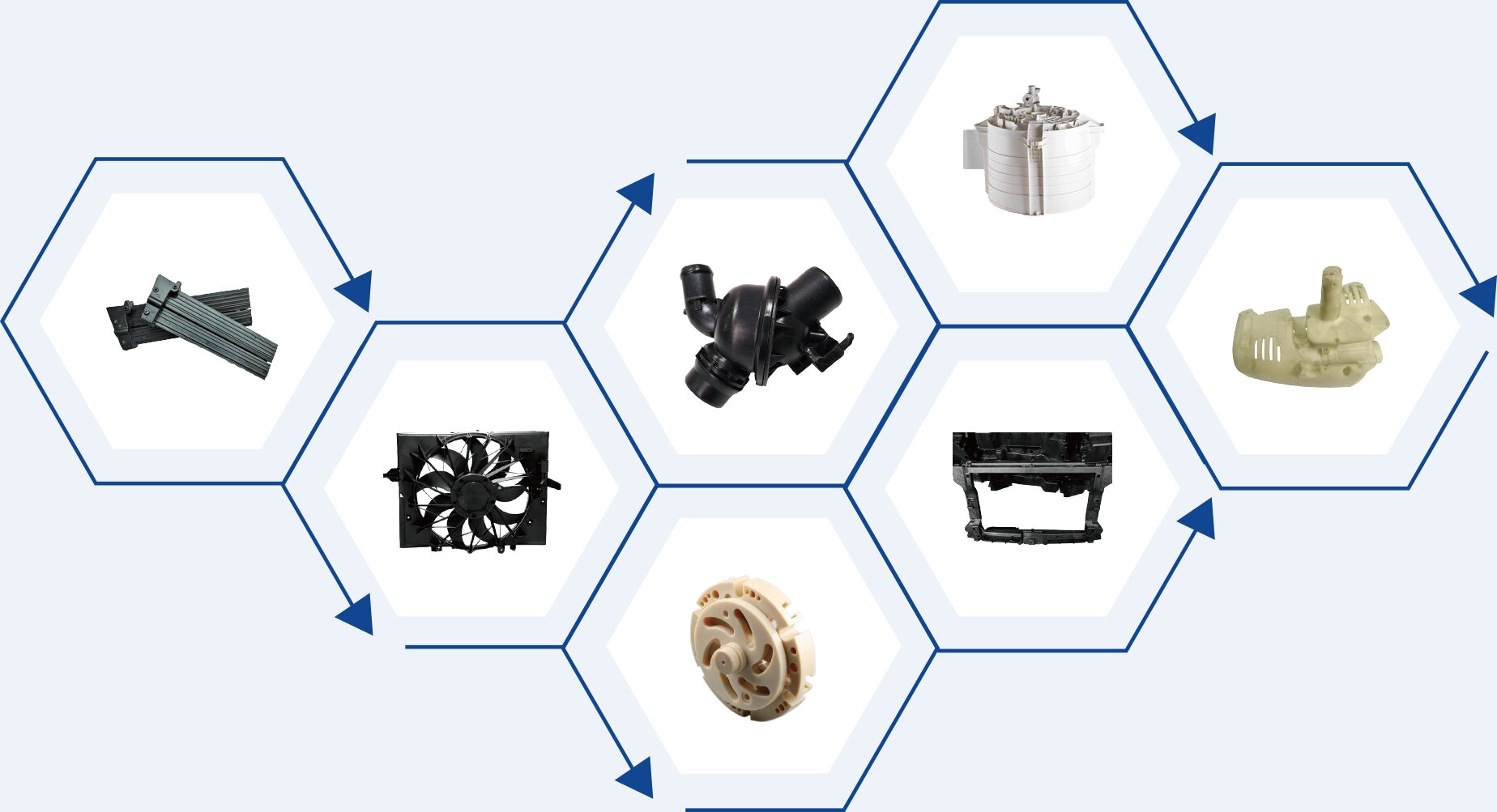 Automotive Industry: Long glass fiber-reinforced PP/PA66 series are used in sunroof frames, center consoles, cooling systems, door panels, and instrument clusters, achieving component weight reduction of over 30% and boosting new energy vehicle range by 8–12%. Long carbon fiber-reinforced PP offers high modulus and low thermal expansion properties.