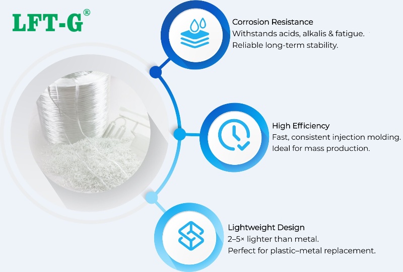 Compared with traditional thermoset composites and metals, LFT has become an ideal metal replacement with its superior mechanical properties. It offers significant weight reduction while delivering the best performance among reinforced thermoplastics.